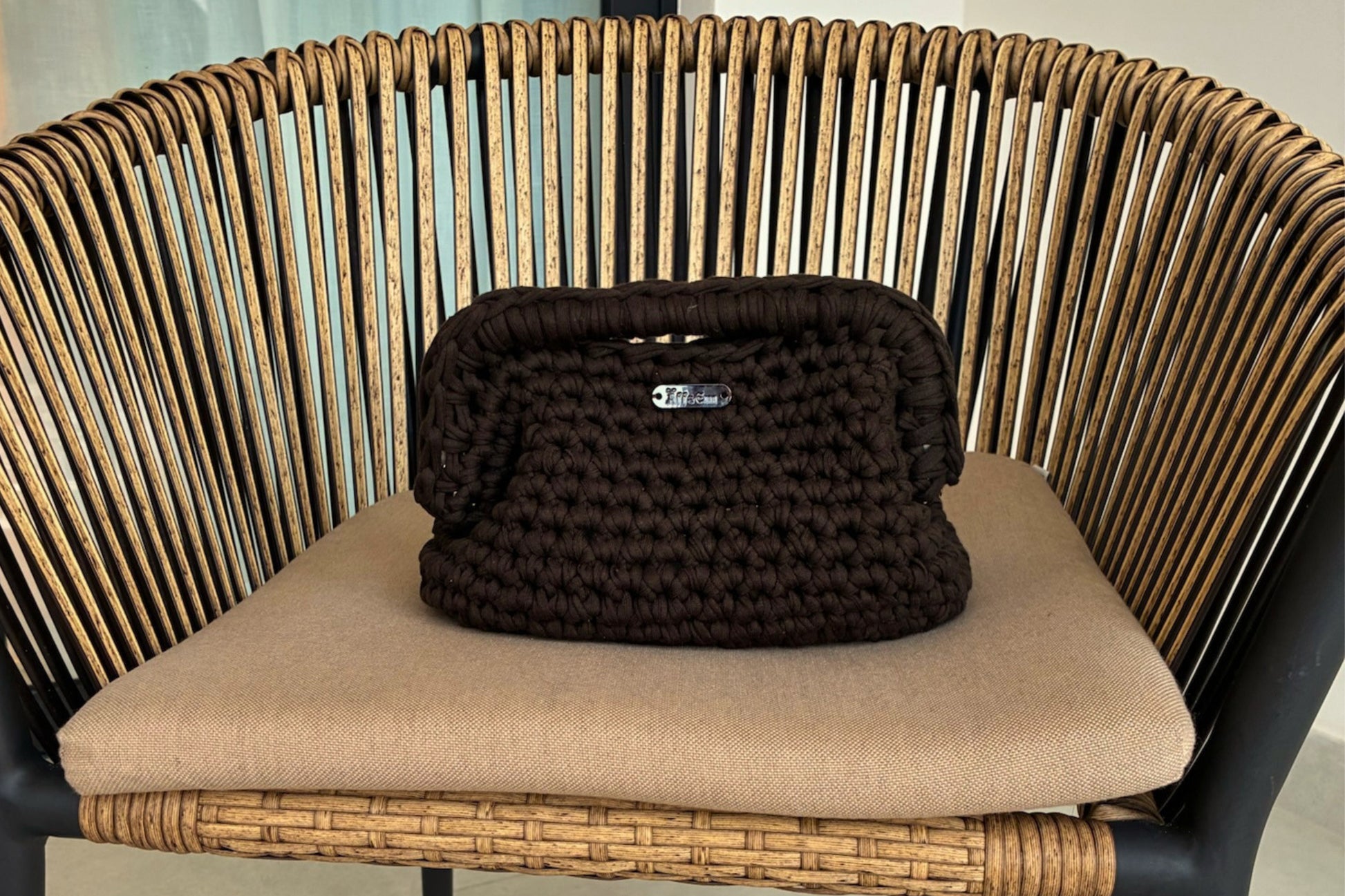 Handmade crochet handbag crafted from 100% recycled T-shirt yarn.