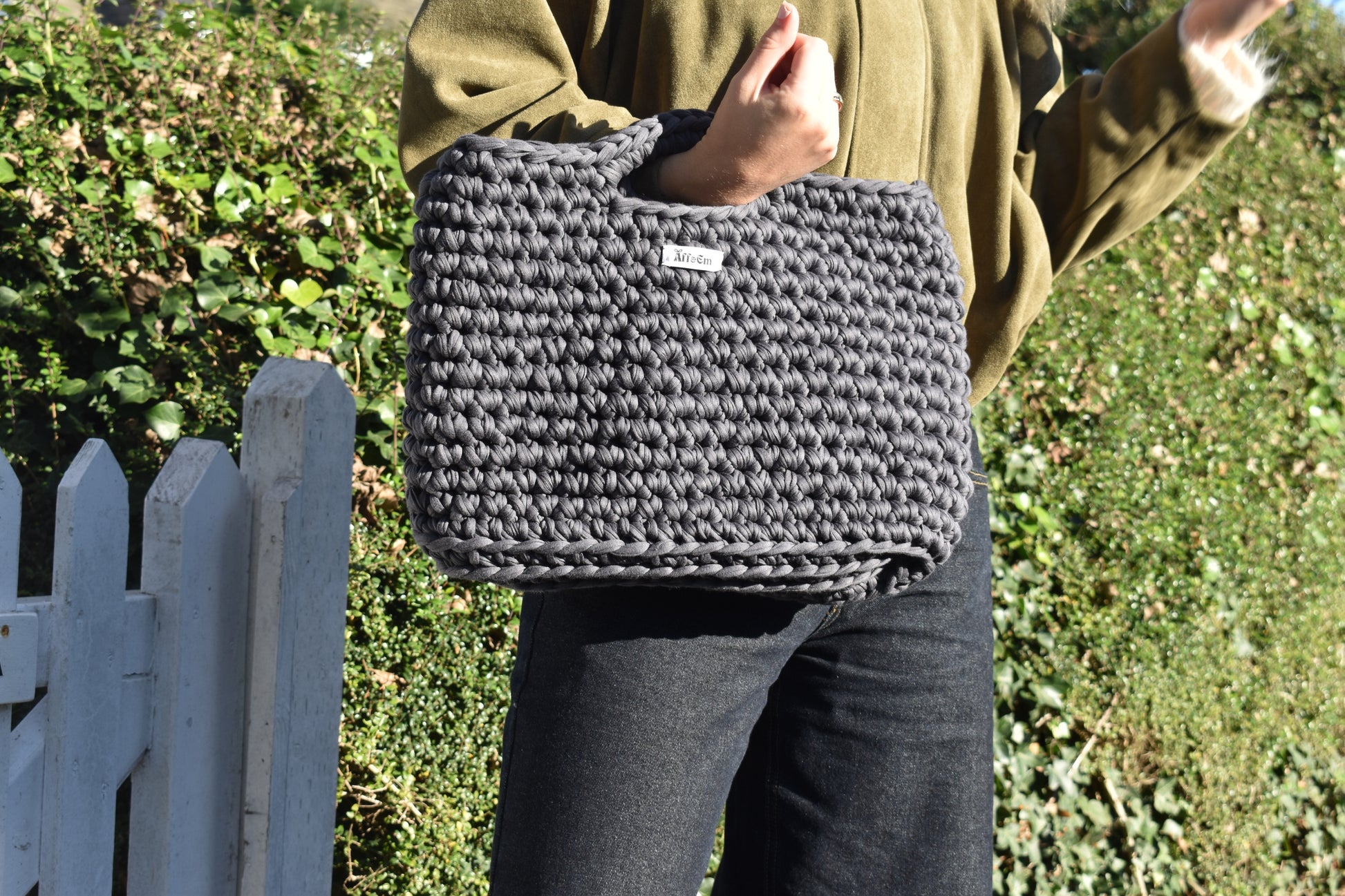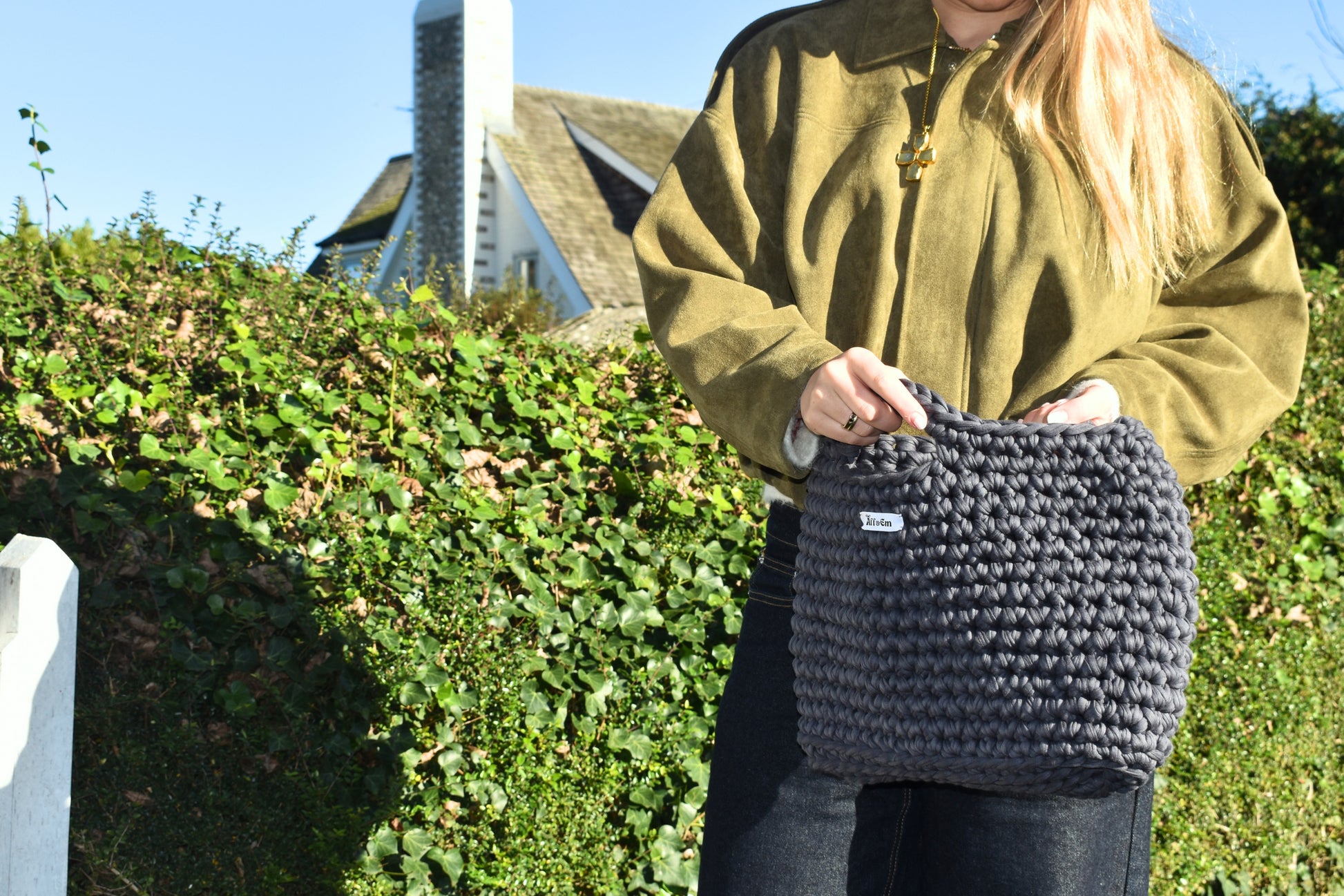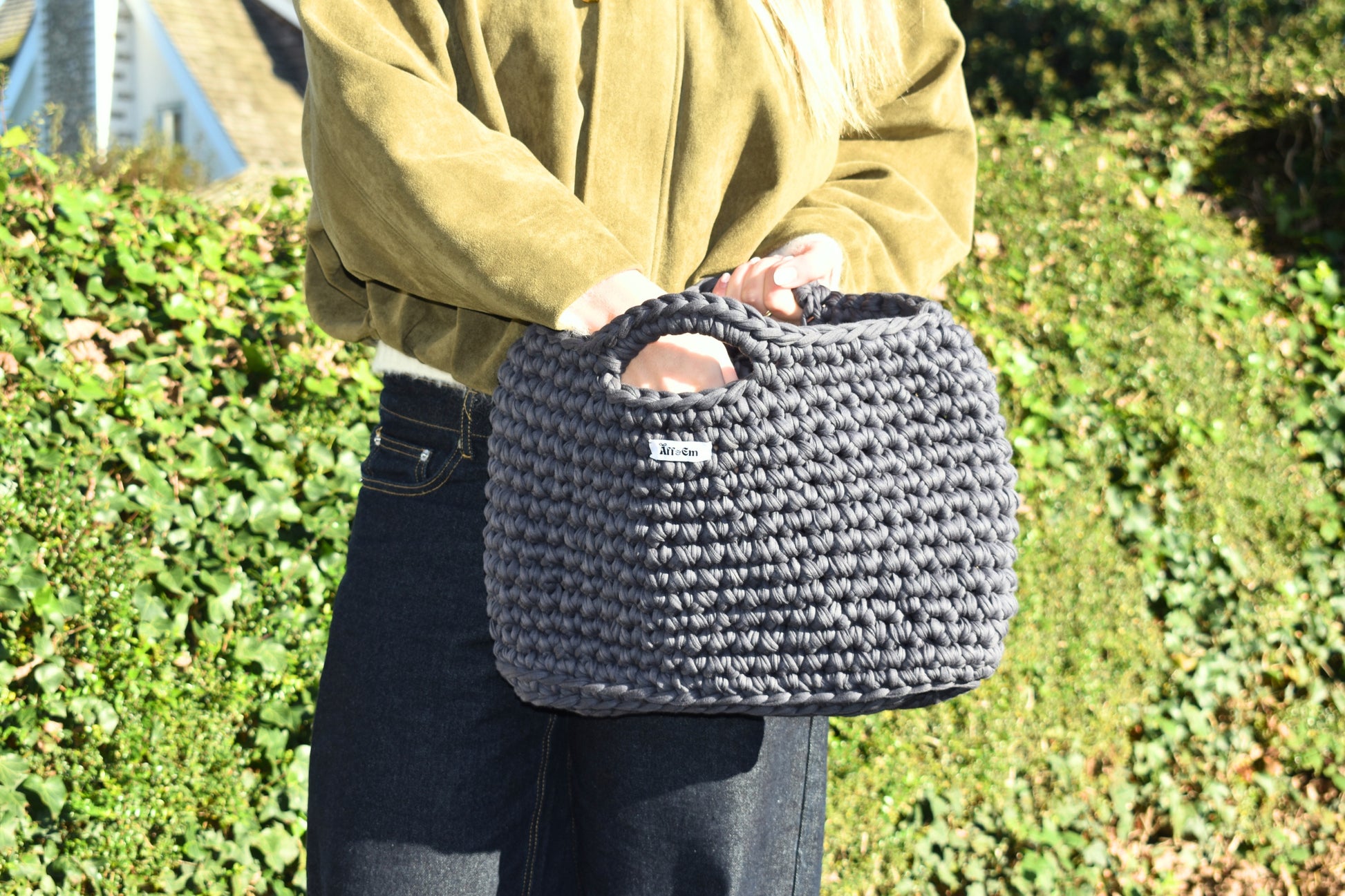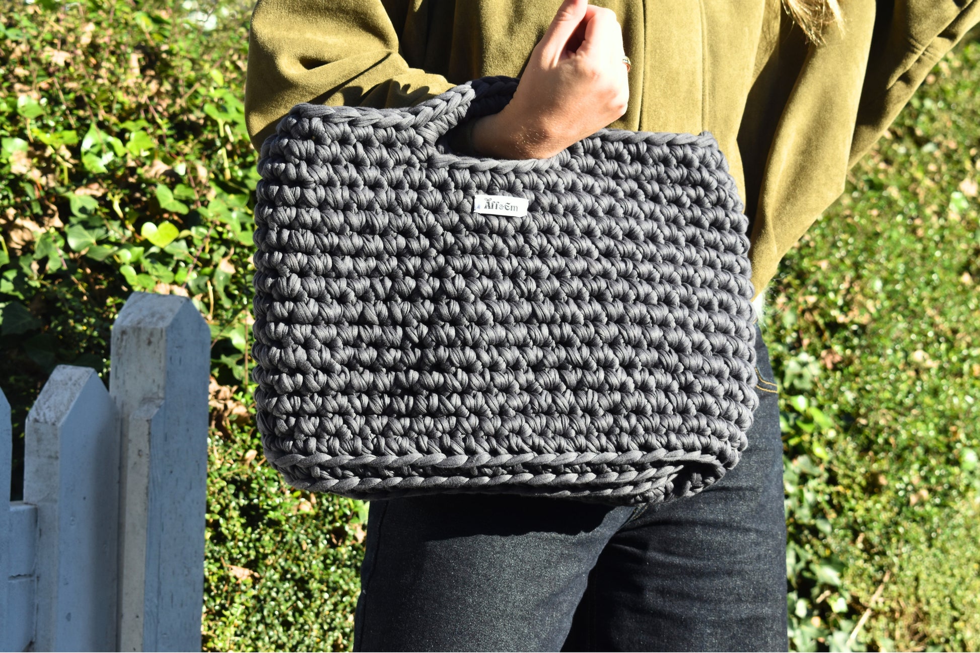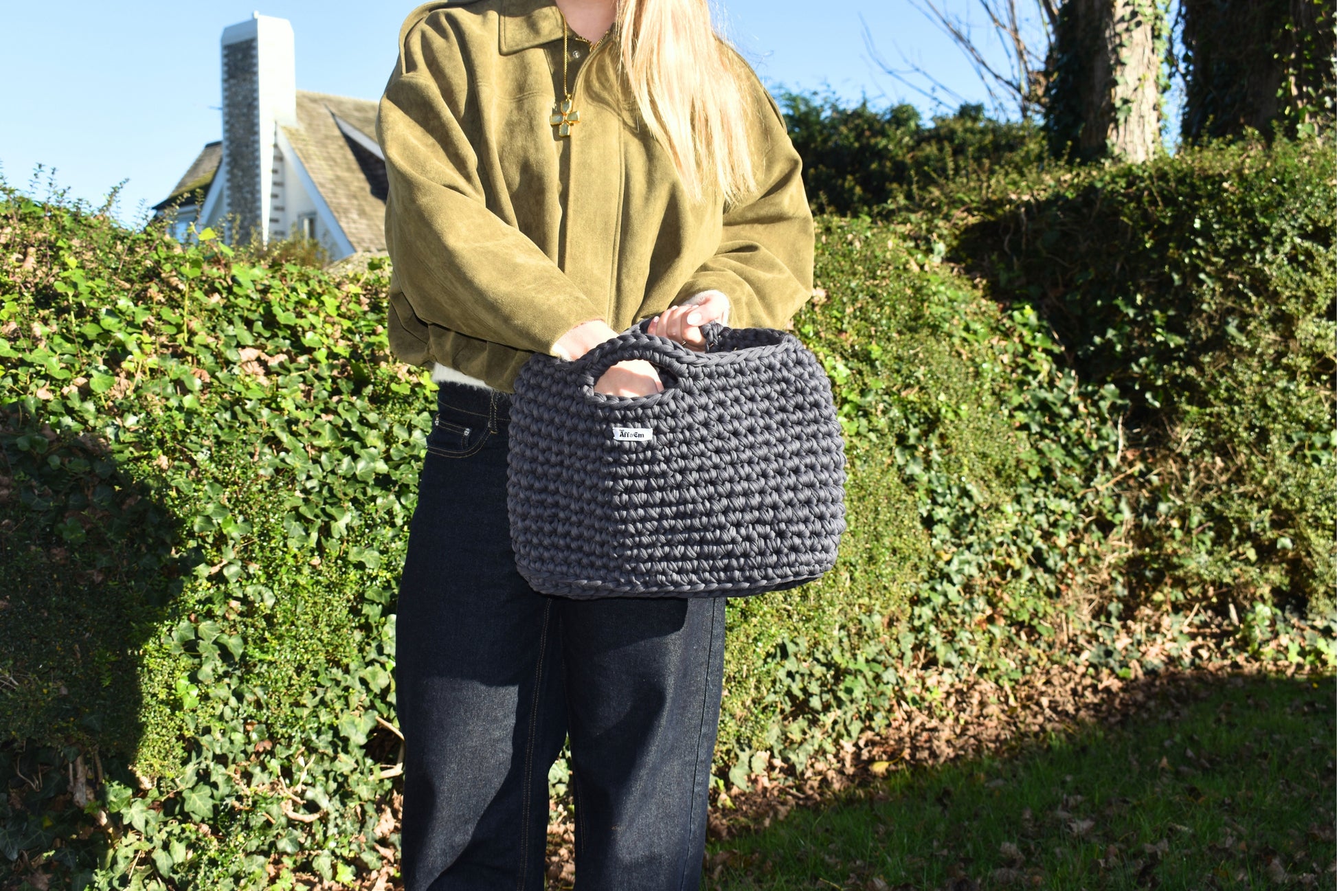 Handmade crochet handbag crafted from 100% recycled T-shirt yarn.