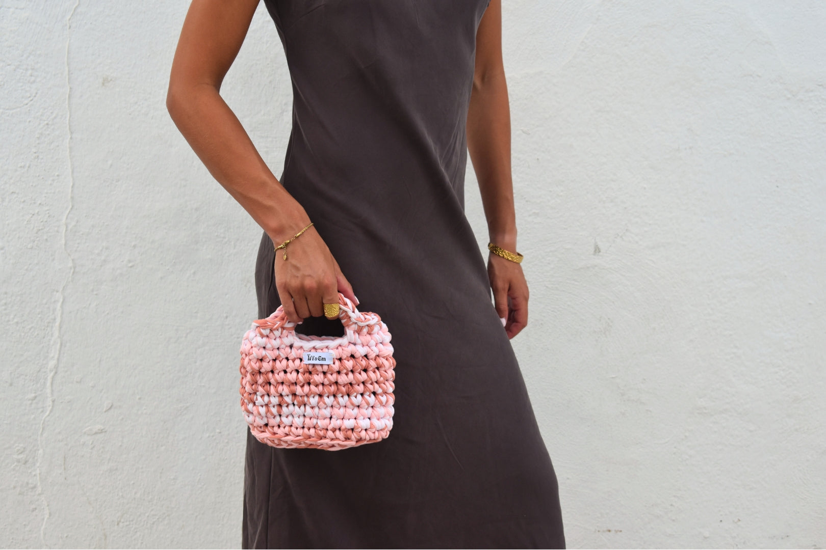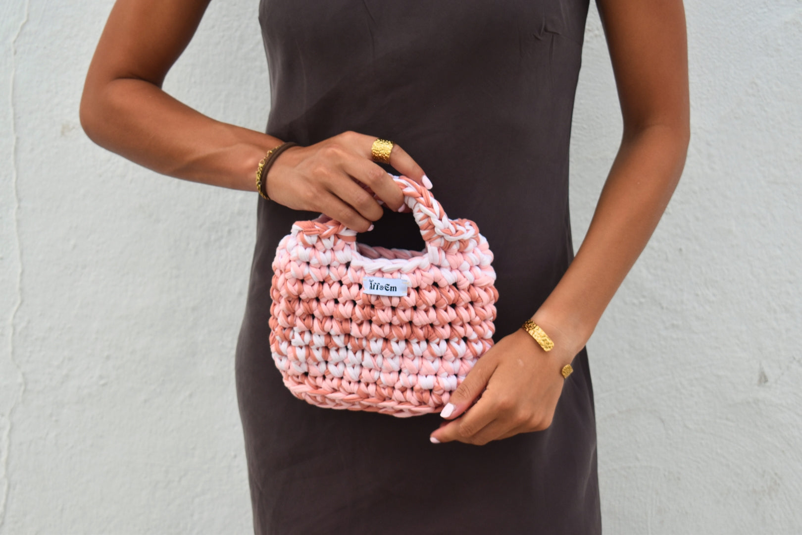 Handmade crochet handbag crafted from 100% recycled T-shirt yarn.