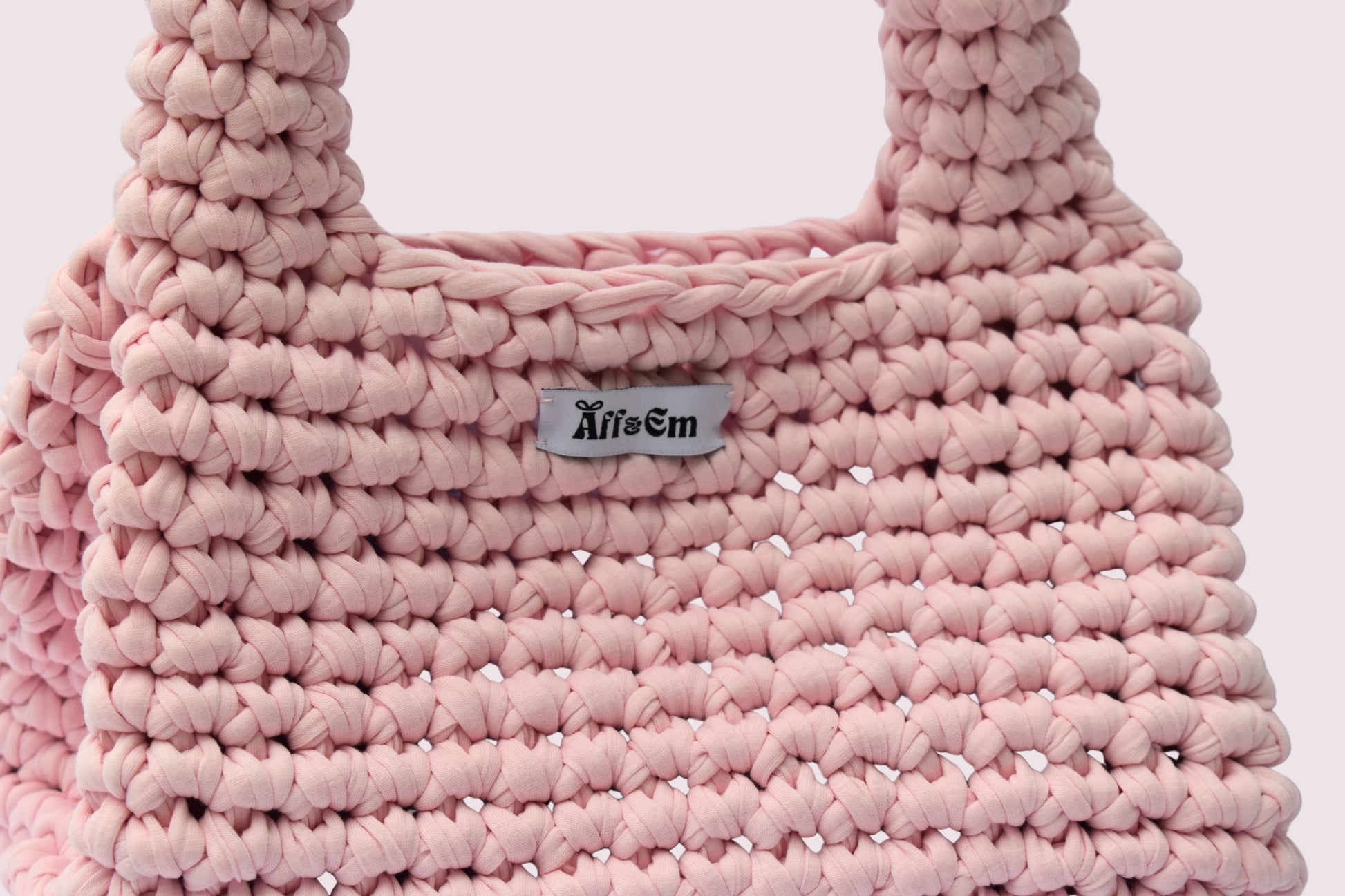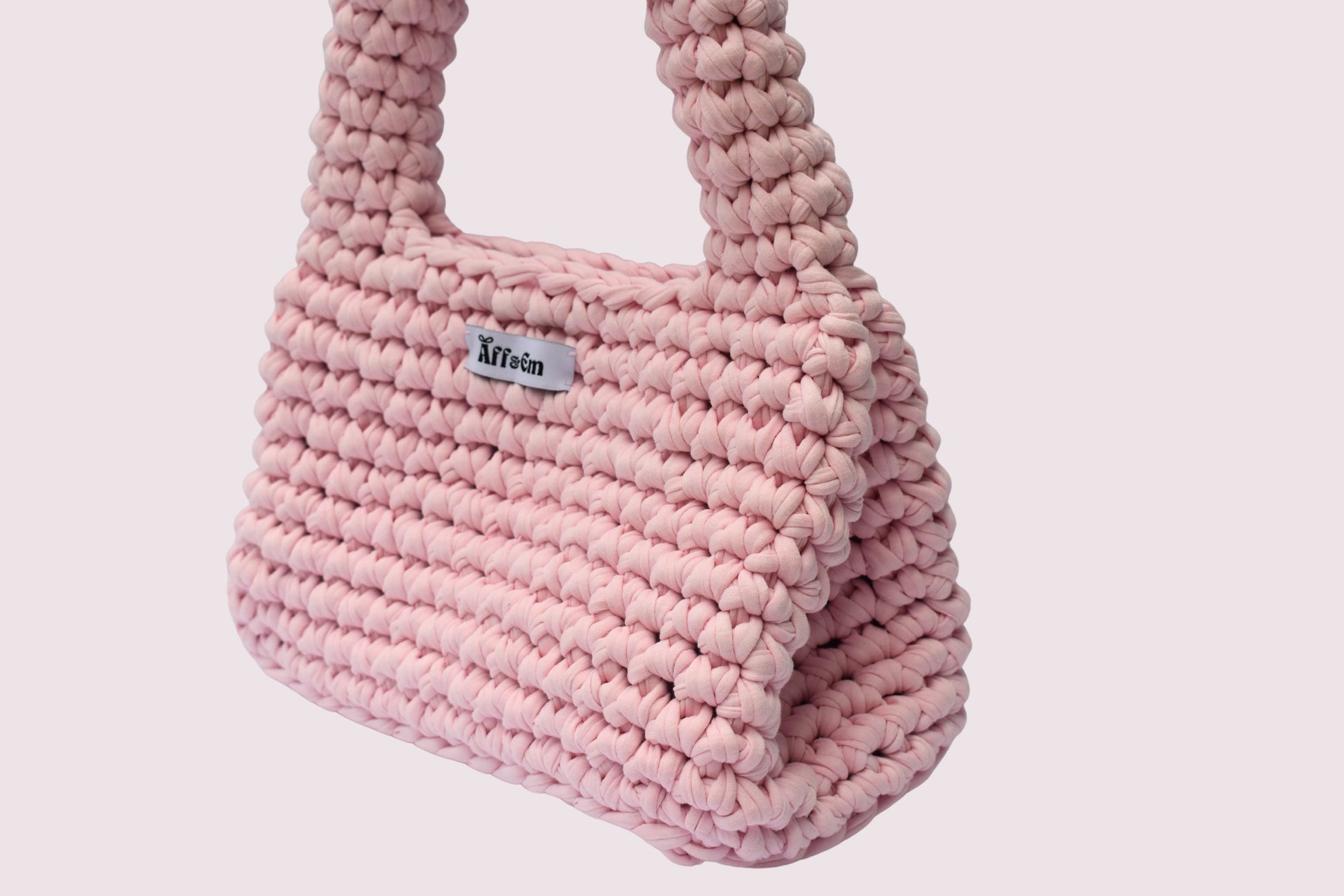 Handmade crochet handbag crafted from 100% recycled T-shirt yarn.