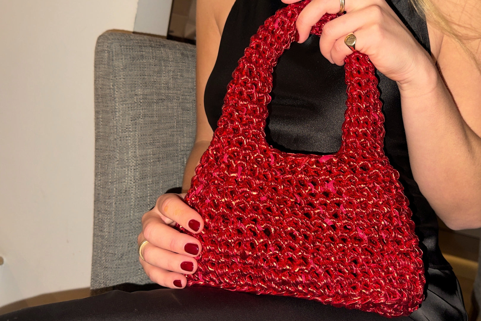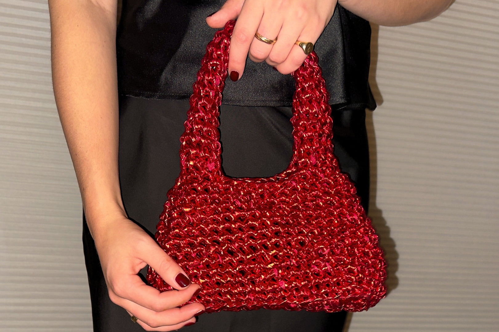 With its softly structured silhouette and shimmering metallic finish, this handmade crochet bag elevates any outfit. Designed for after-dark plans and dressed-up moments, the Nova combines artisanal character with party-ready flair.