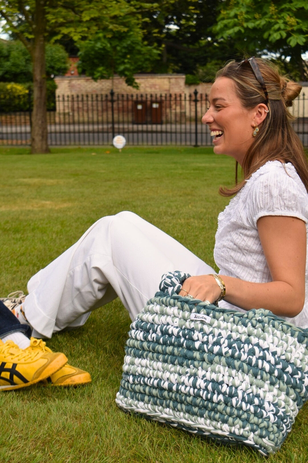 Handmade crochet handbag crafted from 100% recycled T-shirt yarn.